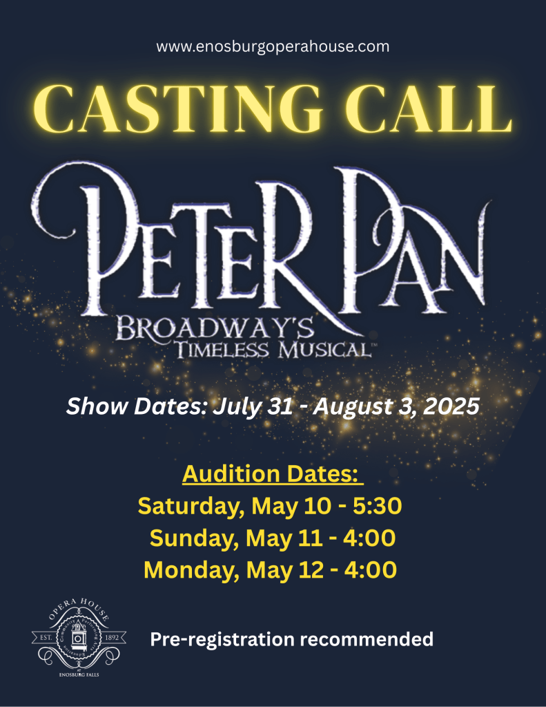 The Friends of the Opera House are excited to bring the beloved story of Peter Pan to life on the Enosburg Opera House stage this summer! Join us for a magical journey to Neverland filled with pirates, fairies, lost boys, and adventures beyond imagination.
