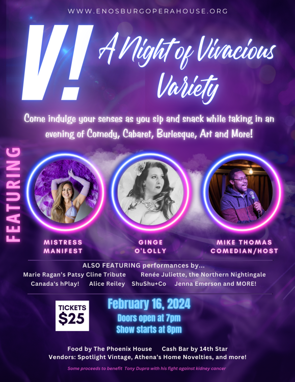 V! A vivacious night of variety and burlesque, coming this Friday to Enosburg Opera House.